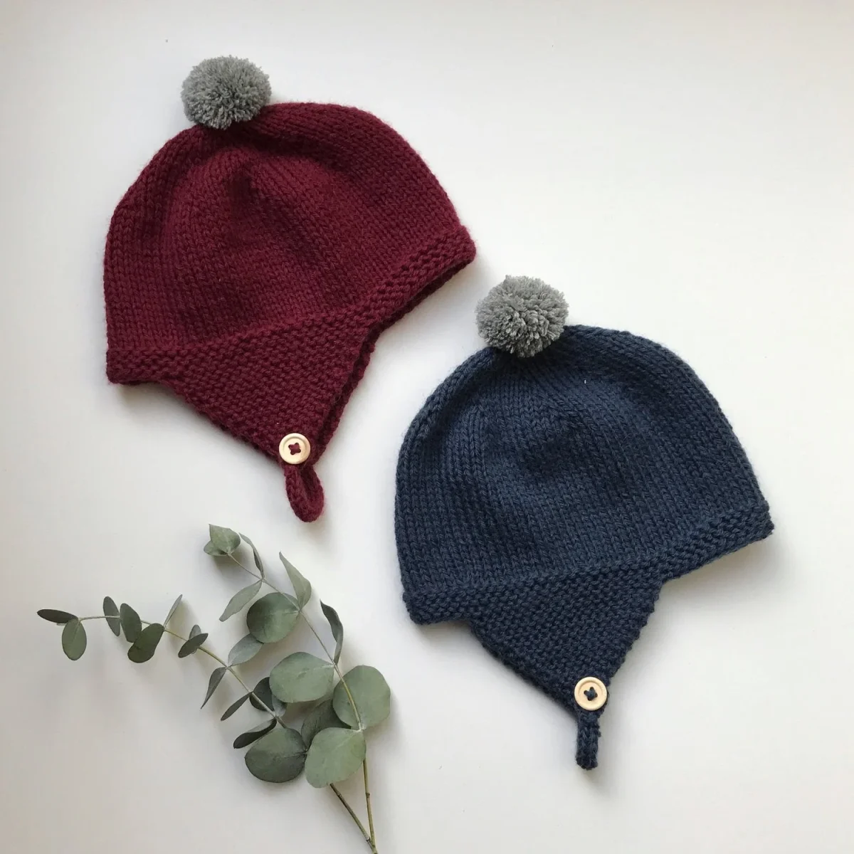 Alberts Pilotmössa stickas runt på strumpstickor uppifrån och ner. Öronlapparna stickas sist, fram och tillbaka. På toppen monteras en pompom.