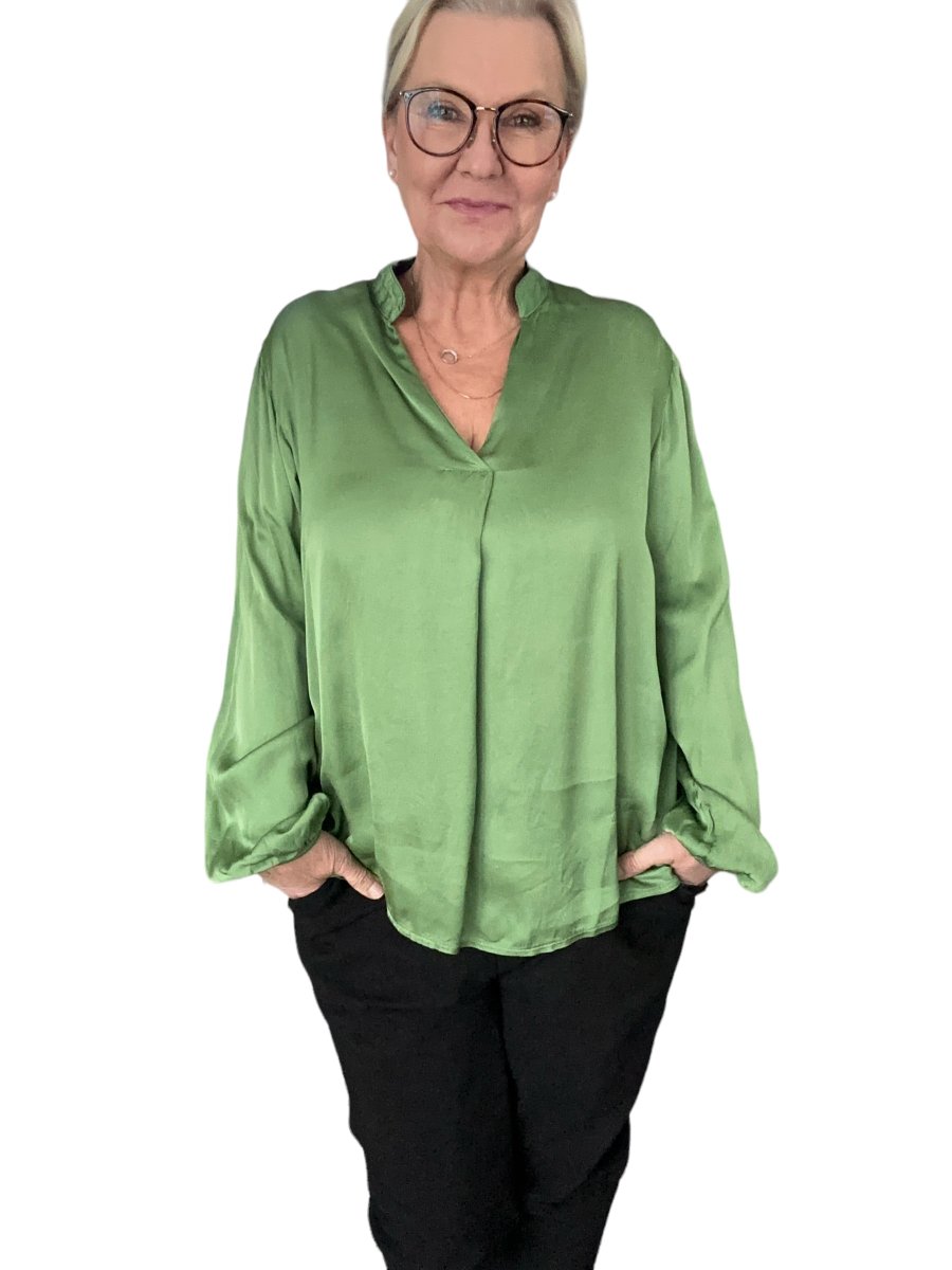 Läcker blus med lång ärm och resår i ärmsluten. Blusen är v-ringad och den är något längre bak än fram.