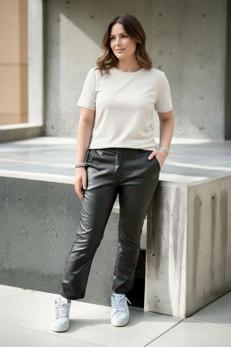 Snygg byxa i fuskskinn med skön stretch, byxan har hällor för bälte. Fuskfickor bak och “gubbfickor” fram. Fodrad insida. Byxan som passar till alla tillfällen