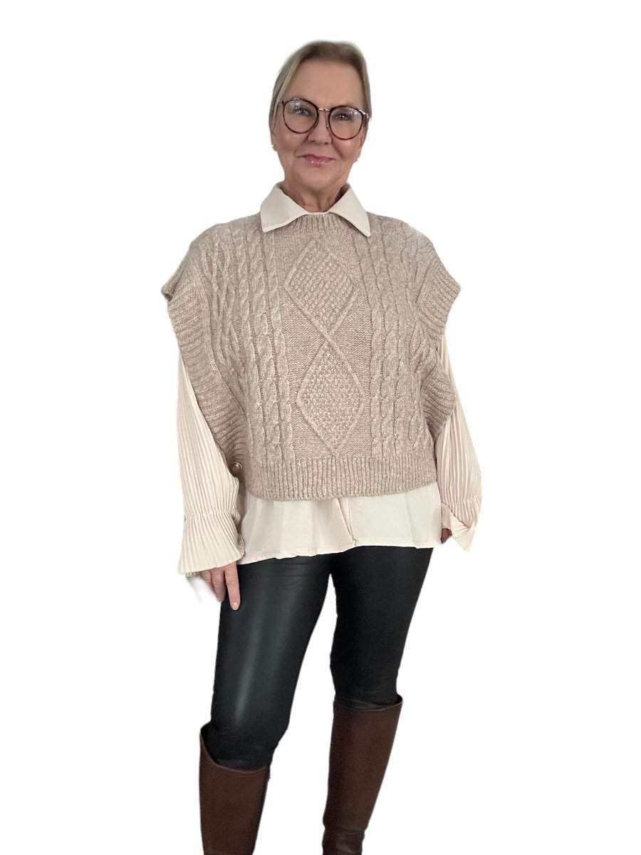 Snygg stickad väst i färgen taupe. Västan har en dekorativ guldfärgad knapp i varje sida.