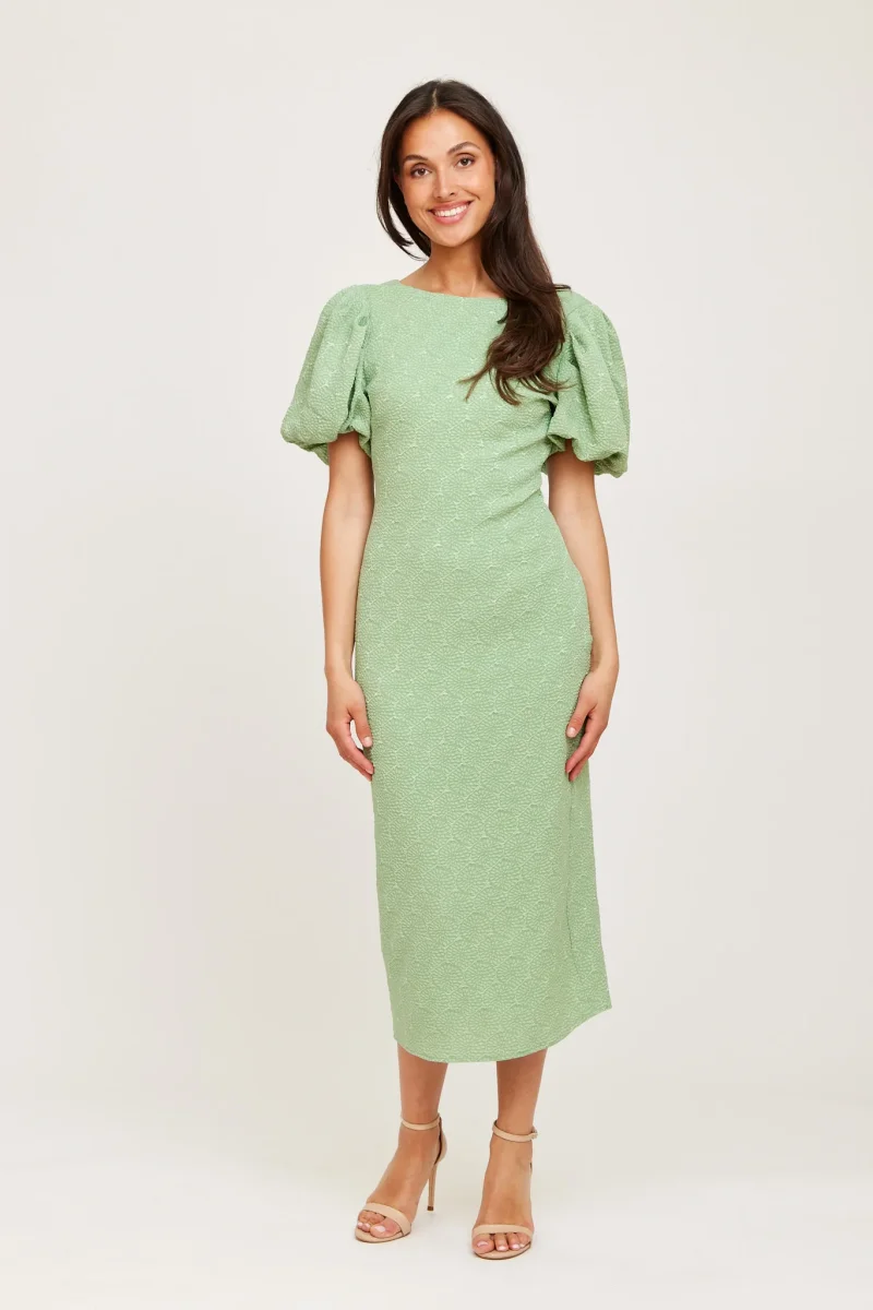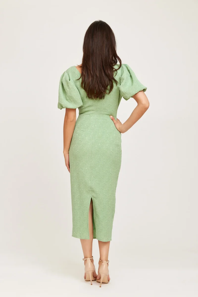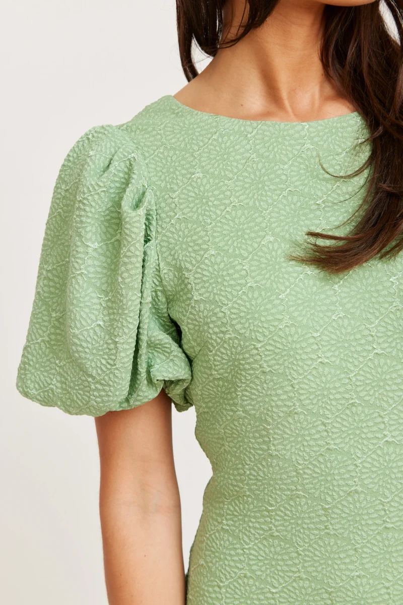 A refined midi dress crafted in a soft, textured fabric that offers both comfort and elegance. Designed with feminine puff sleeves and a flattering fitted silhouette, it highlights the waist while maintaining a sleek modern look. The clean round neckline and streamlined shape make it perfect for both daytime events and evening occasions.