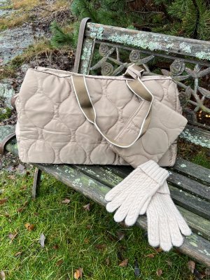 Snygg quiltad väska med liten tillhörande väska / necessär. Ett större och ett mindre innerfack med dragkedja samt två mindre fack utan dragkedja. En längre avtagbar axelrem finns med. Mått 50×30 cm