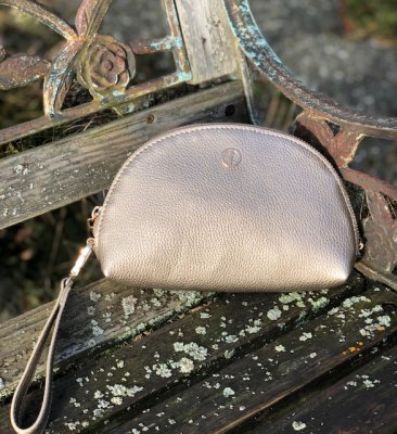 Snygg necessär i veganskt konstläder. Guldfärgade metalldelar och fint foder med guldfärgade prickar på insidan.